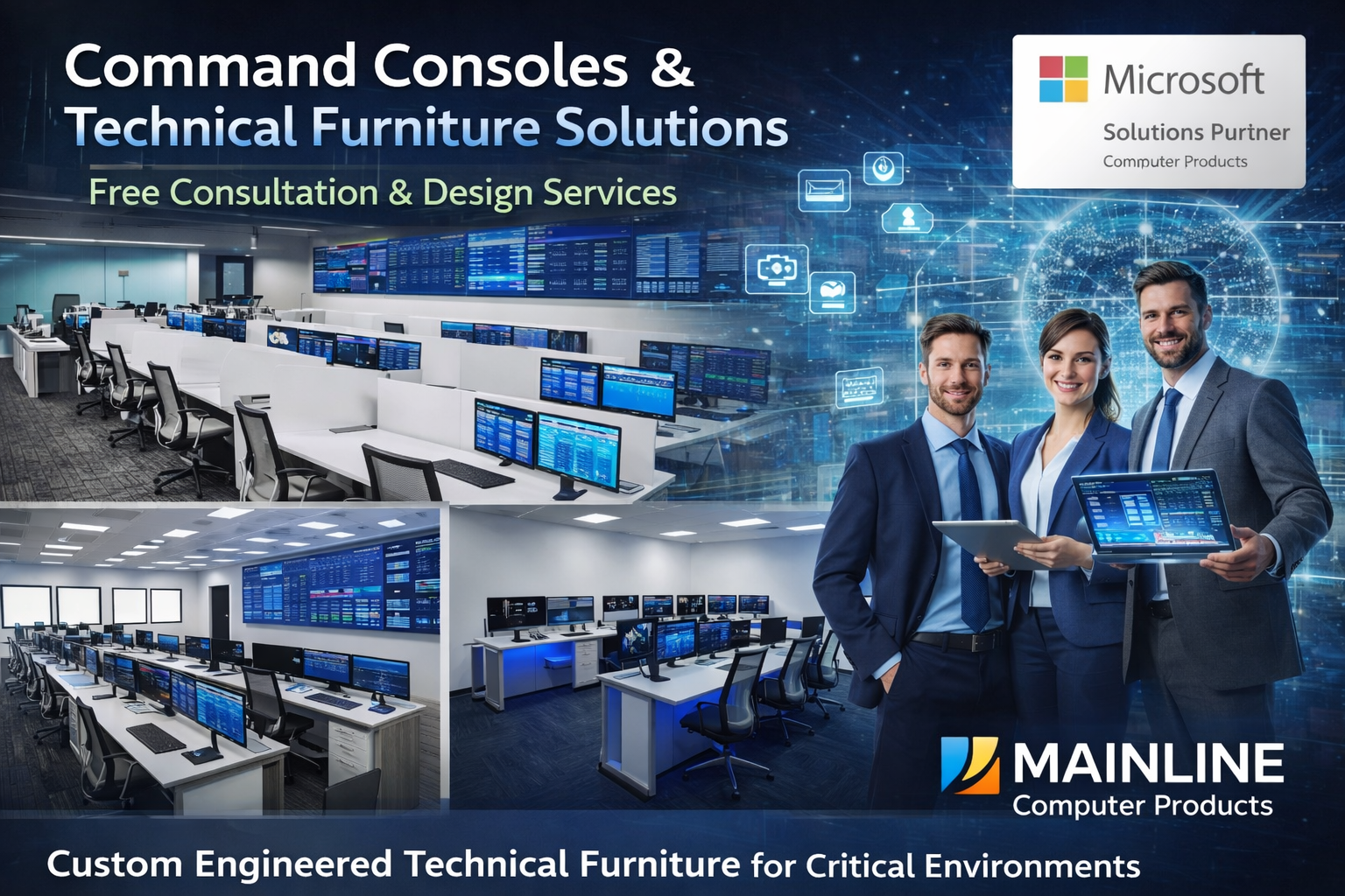Contact Mainline for a Free Design & Consulting Session to discuss your next control room or data center console project. Call (800)-686-5312 or email: Sales@MainlineComputer.com